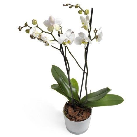 Teleflora Fleurs et Bouquets - Jolie - Una orquídea de color blanco intenso con un toque amarillo en el centro. Una orquídea "passe-partout", popular tanto por su estilo contemporáneo como por su lado más tradicional. La orquídea está plantada en una maceta de plástico.